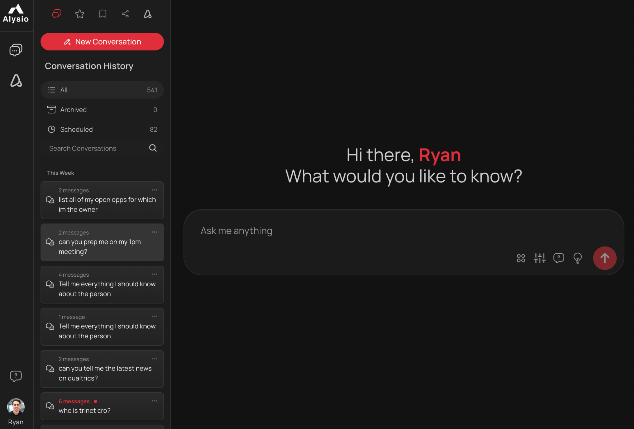 A couple of reasons. The first is that Alysio brings you answers and recommendations based on YOUR data, contextualized for how your business operates. The second is that Alysio gives you the ability to take action directly in your systems: update that account record, schedule a meeting, and enrich data for outbounding–all in one place.